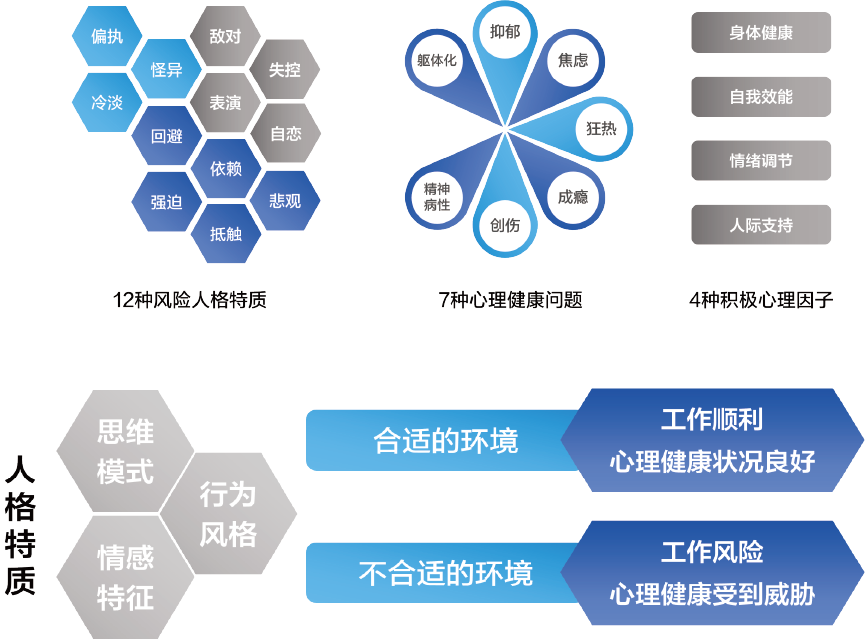 测评结果:全面呈现个体在工作中的心理状态和行为表现,帮助企业在招聘和筛选过程中预防和管理心理健康风险,确保员工在高压环境中保持最佳状态,实现组织整体效能最大化。